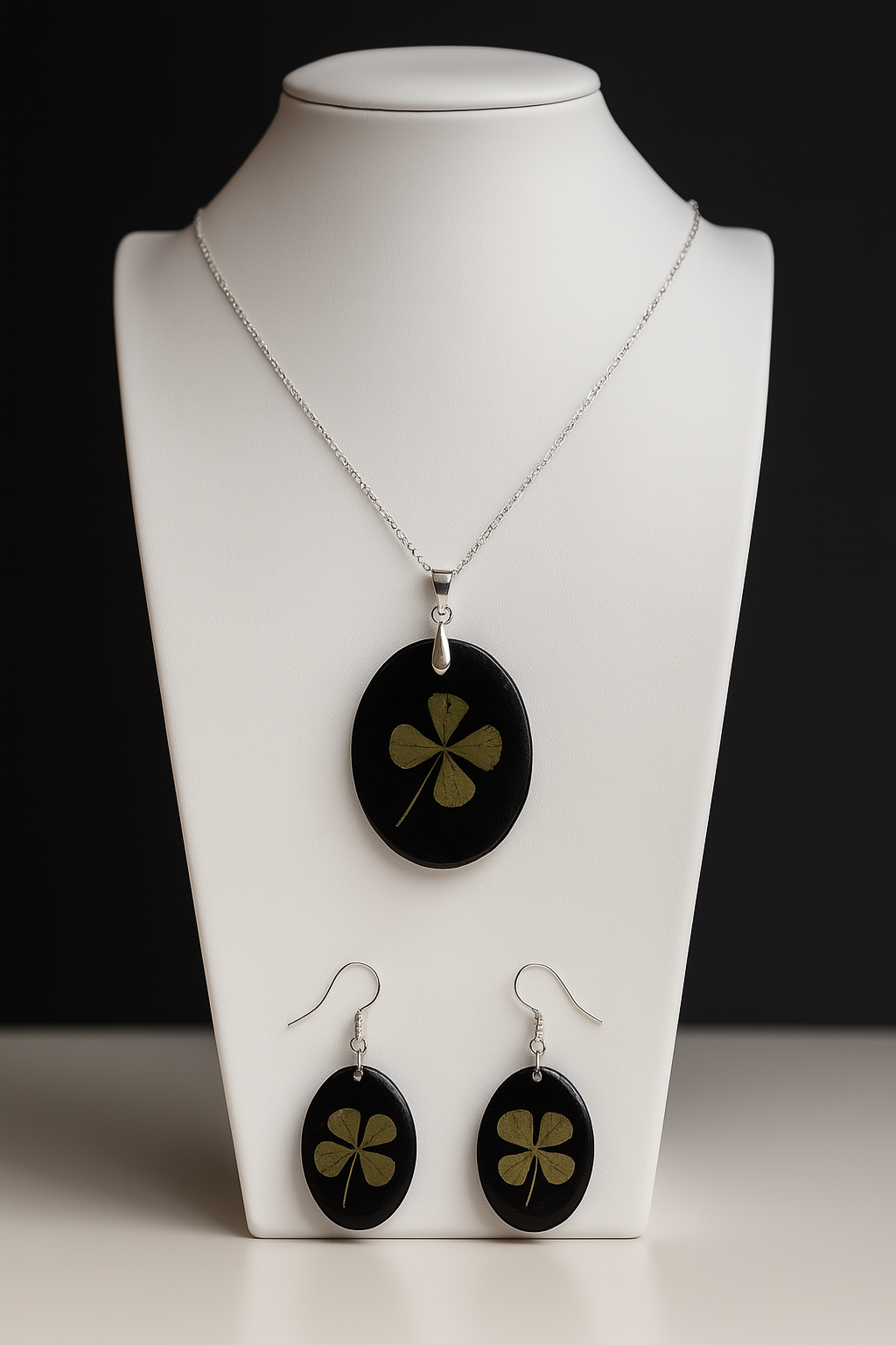 Portez la chance près de vous avec cette parure artisanale. Réalisée à la main, elle capture un véritable trèfle à quatre feuilles dans une résine noire brillante, symbole universel de bonheur et de protection.
