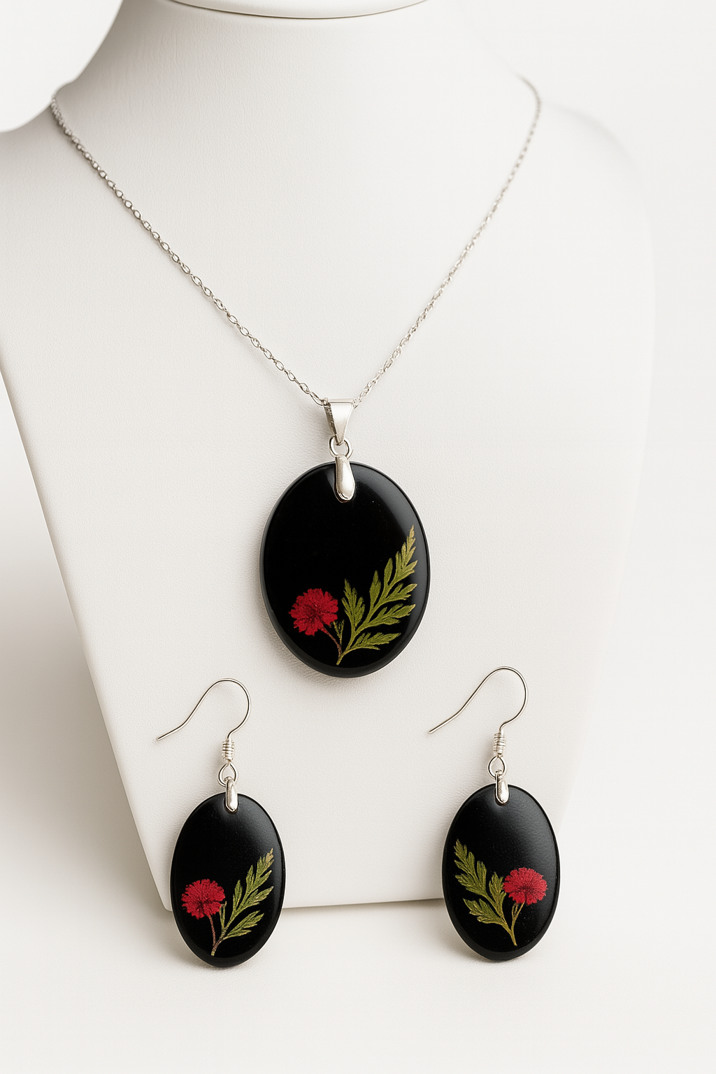 - Pendentif : ovale en résine noire, orné d’une fleur rouge éclatante et d’un feuillage vert finement disposé. Suspendu à une chaîne argentée discrète, il évoque la beauté sauvage et la poésie des jardins secrets.